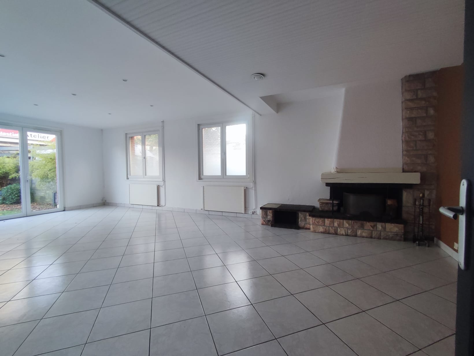 séjour lumineux avec cheminée donnant sur jardin, cuisine équipée et